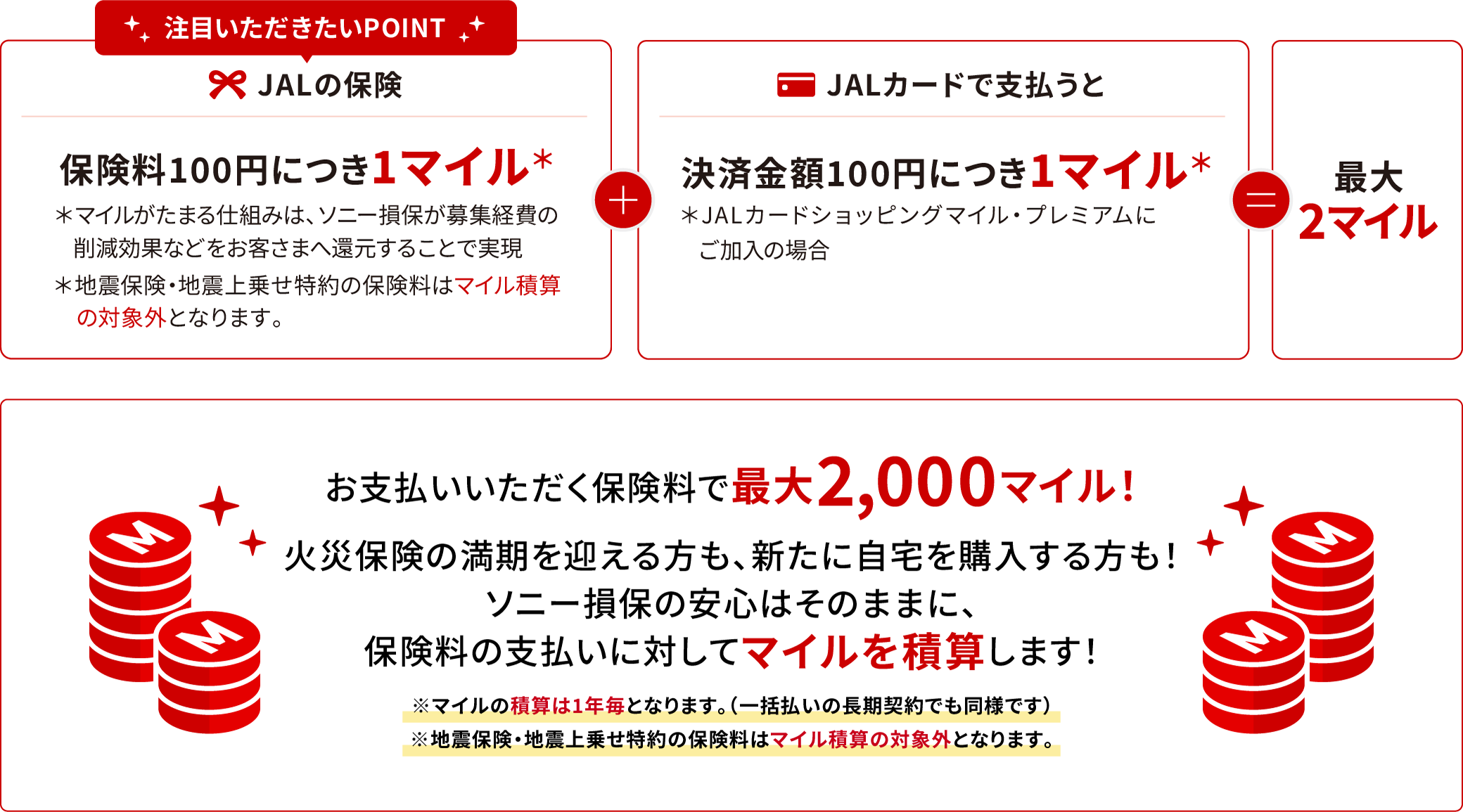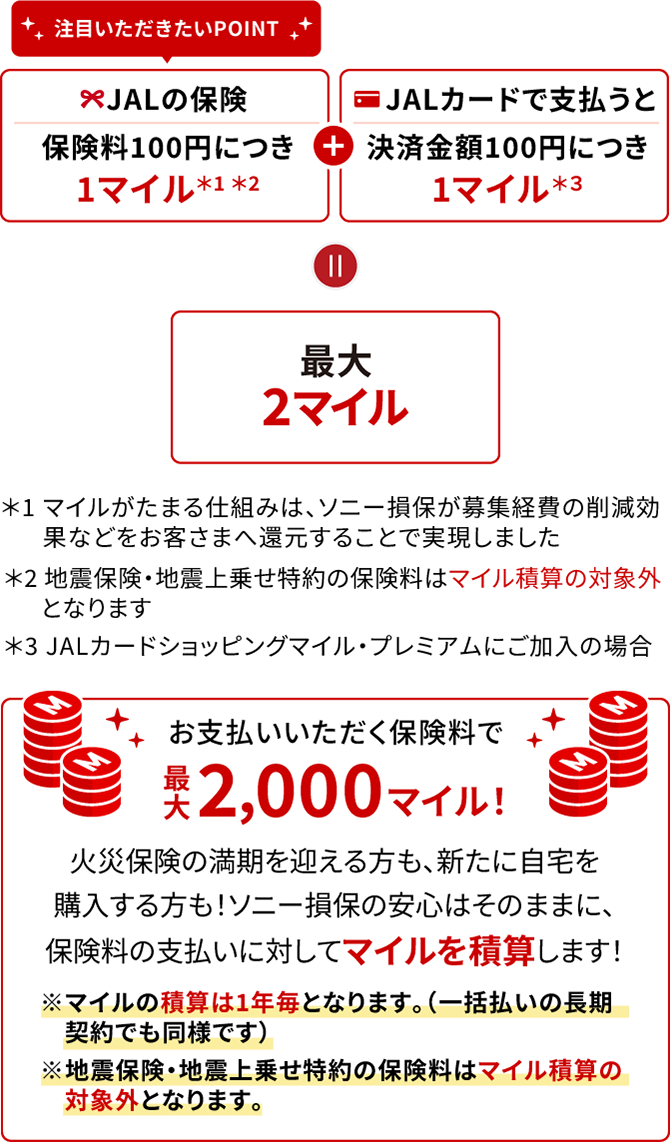 ※現在、ソニー損保でご契約中の火災保険を「JALのマイルがたまる火災保険 by ソニー損保(以下、「対象商品」とします。)」に切替えすることや、ソニー損保の火災保険を継続される際に対象商品へ変更することはできません。