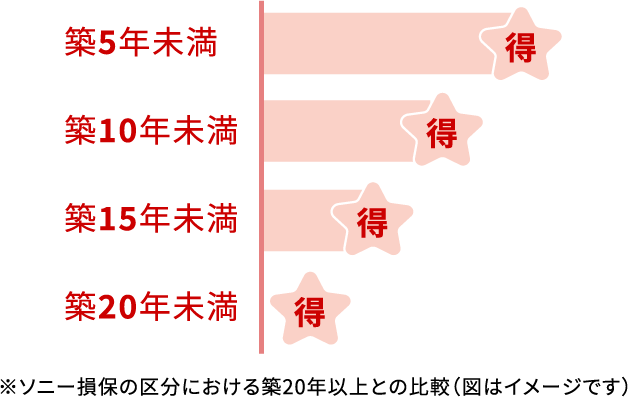 建物の経年によるリスク実態を保険料に反映するため、築年数に応じた保険料率を適用します。この保険料率により、新しい家ほど保険料はおトクになります。